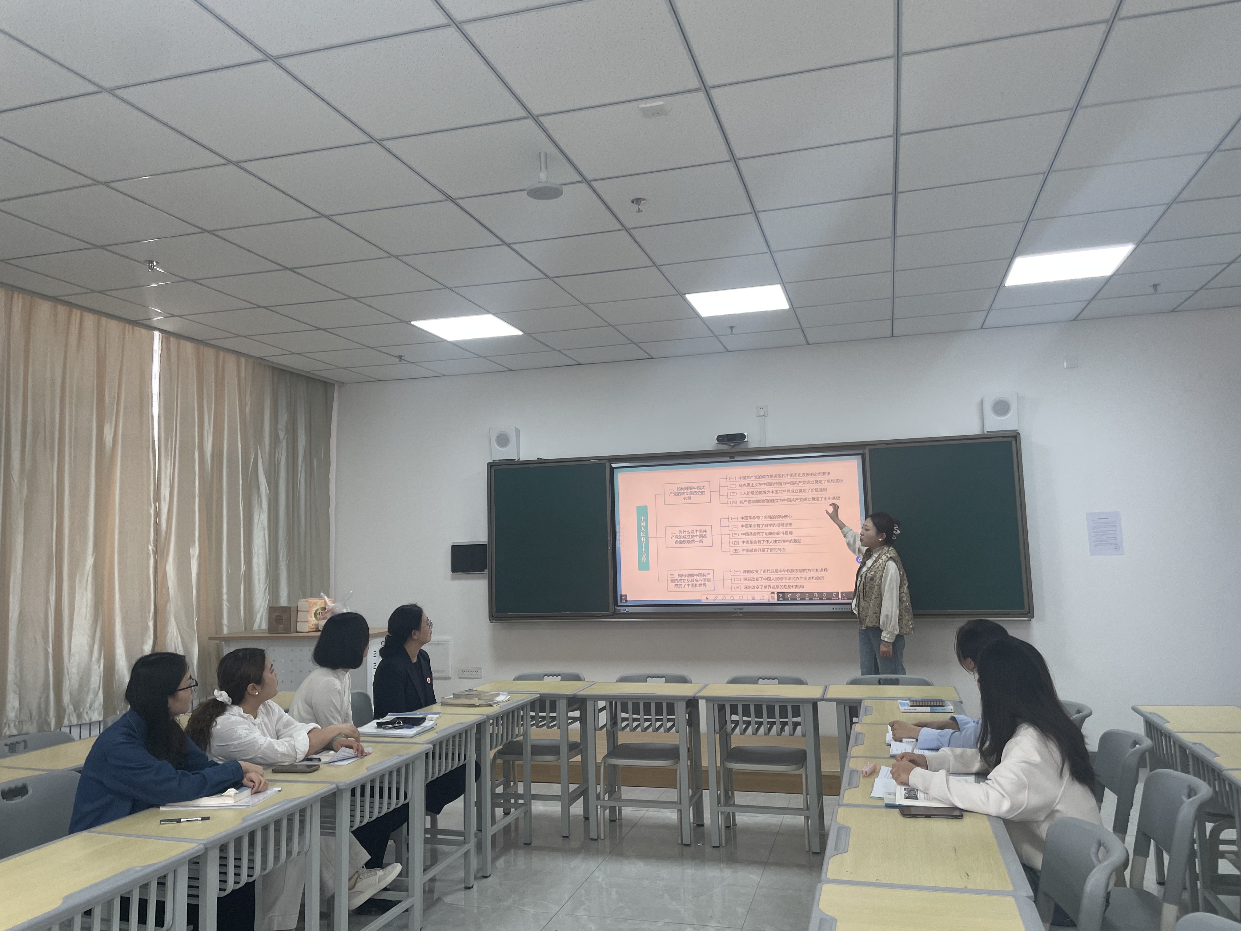 会上,教研室主任李亚男首先强调了《中国近现代史纲要》课在教学中要讲清楚“四个选择”的问题,要求任课教师在备课和课堂教学过程中要高度重视课堂设计。她针对《中国近现代史纲要》第四章“中国共产党的成立”以及第五章“中国革命的新道路”进行了示范讲解。与会教师各抒己见,围绕课程内容、重难点、课堂教学设计、疑难问题进行了深入的交流与沟通。