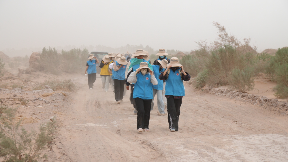 活动首日,师生迎着风沙开启了18公里的沙漠徒步之旅。沿途实地观摩梭梭林生态修复成果,亲眼见证了“沙漠变绿洲”的生态奇迹。在四方墩烽火台遗址,学习烽火台作为数百年来治沙人确定方位地标的重要意义,深刻理解了生态治理与文化传承的密切关系。
