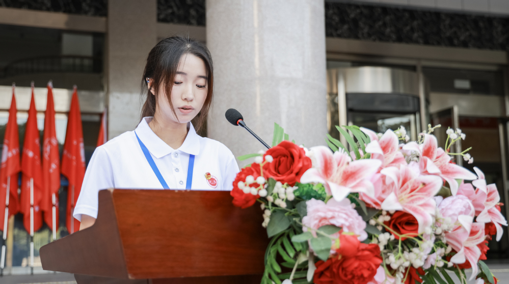 社会实践队成员任佳欣同学代表全体社会实践队员发言,她表示将带着课堂所学知识深入基层,在服务中增长才干,在实践中诠释青年担当。