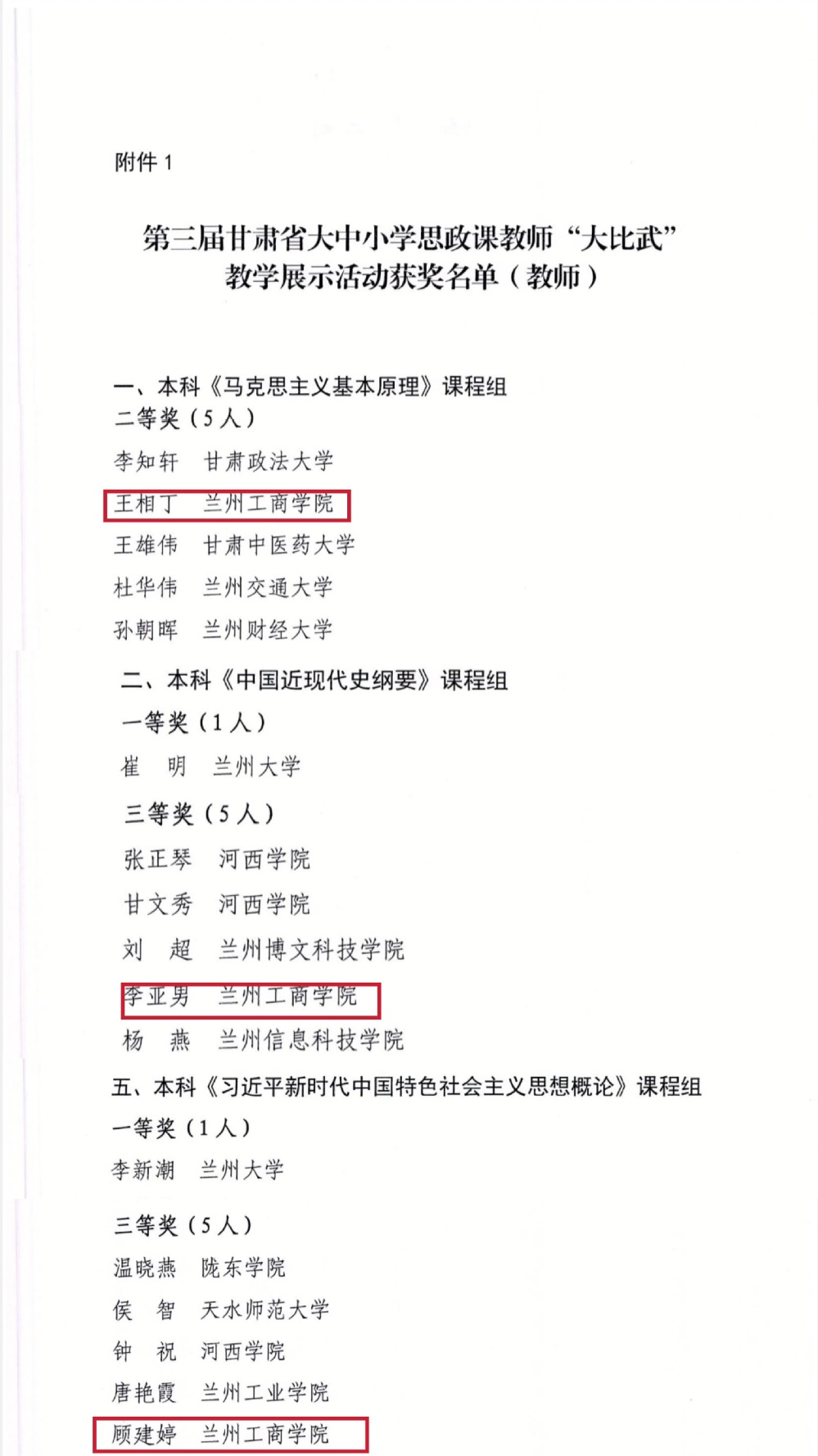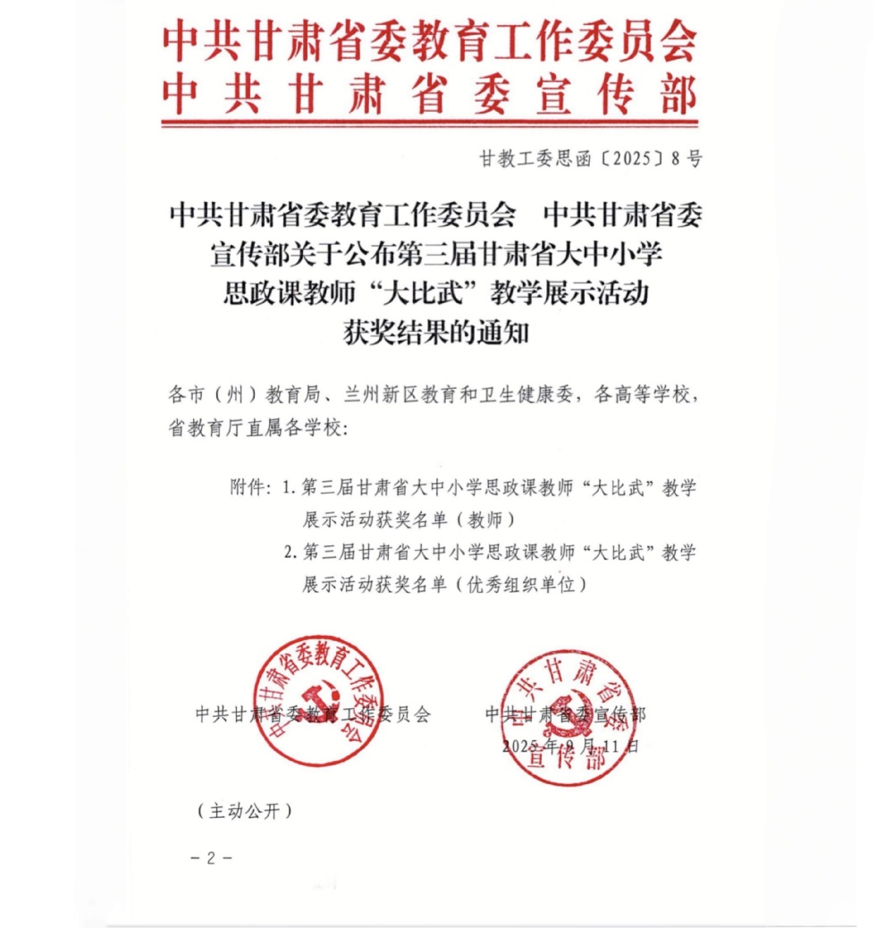 9月11日,甘肃省教育厅公布了第三届甘肃省大中小学思政课教师“大比武”教学展示活动最终结果,我校马克思主义学院三位教师凭借扎实的教学能力和专业素养脱颖而出。其中,王相丁老师荣获本科《马克思主义基本原理》课程组二等奖、李亚男、顾建婷两位老师分别荣获本科《中国近现代史纲要》课程组、本科《习近平新时代中国特色社会主义思想概论》课程组三等奖。