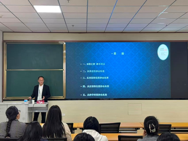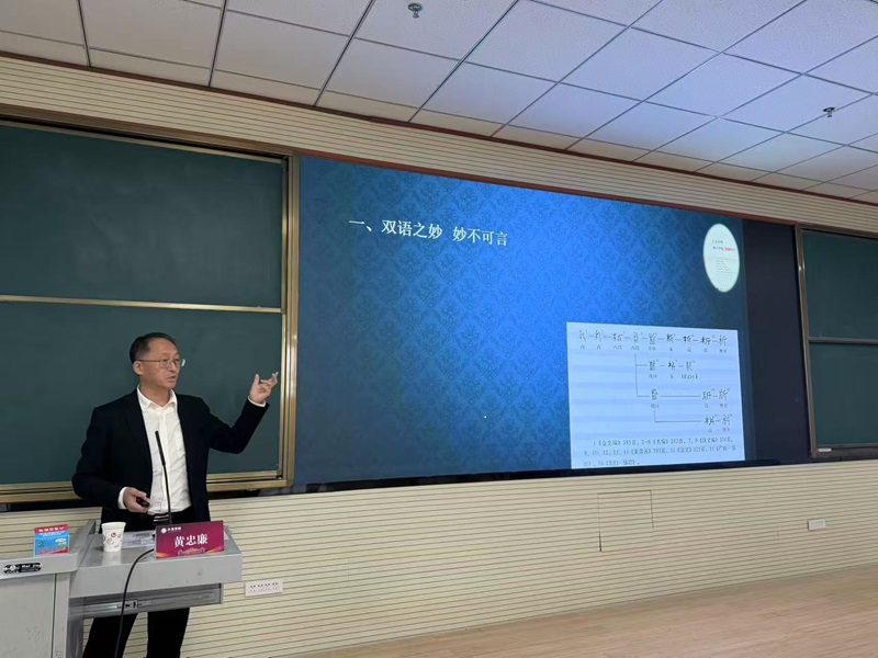 讲座伊始,黄忠廉教授指出:“语言之妙,妙不可言;双语之妙,更不可言。”这个开场白瞬间吸引了全场师生的注意力。他强调,从单语到双语的过渡不仅是语言能力的提升,更是思维方式的转变。只有通过深入剖析语言的内部结构,才能获得全面的理解,从而更好地认知和面对世界。