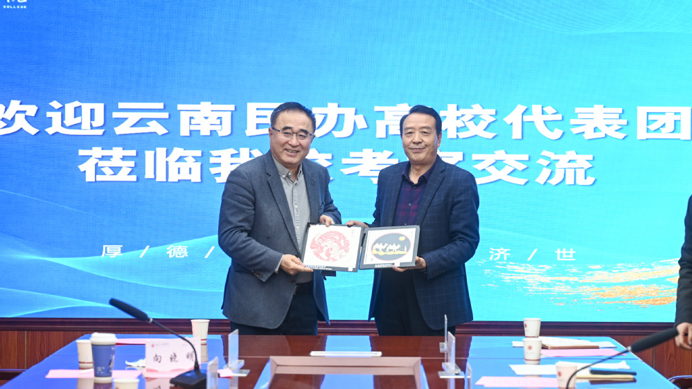 会上,云南民办高校代表团团长邹平教授简要介绍了代表团成员并阐述了此次参访的目的,校长王华栋教授在致辞中对代表团的到来表示热烈欢迎,详细介绍了我校的办学历史和近年来重点工作的开展情况。在自由交流环节,双方代表就民办高校管理体制、产教融合推进方式、师资队伍发展稳定等方面进行了深入交流,现场气氛热烈融洽。最后,邹平教授总结讲话,对我校的热情接待和周密安排表示衷心感谢,并期待未来进一步加强沟通与合作。会议最后,双方互赠纪念品并合影留念,为此次交流活动留下了珍贵的记忆。