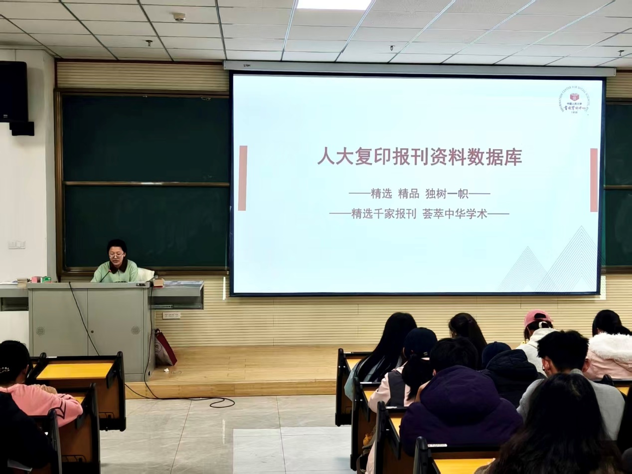 为进一步提升师生人文社科类数字资源检索利用能力,11月11日下午,图书馆“数字资源推广进学院”系列活动在综合教学楼C504室举办,活动聚焦《人大复印报刊资料全文数据库》实操应用,师生积极参会,现场学习氛围浓厚。