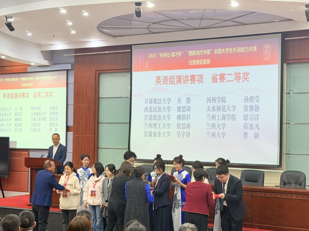 近日,2025年“外研社·国才杯”“理解当代中国”全国大学生外语能力大赛省赛在河西学院圆满落幕。我校学子在比赛中表现优异,凭借扎实的语言功底、出色的综合素养与昂扬的精神风貌,在多个赛项中脱颖而出,最终荣获两项重要奖项。