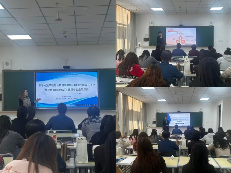 三位参赛教师代表团队依次登台,分别展示了教学实践创新成果。雒融融老师以《中华民族共同体概论》为例,讲解“BOPPPS模式”在教学方法革新与价值引领共振中的应用探索;王相丁老师围绕《马克思主义基本原理》,阐述OBE理念下“一心两翼三目标”线上线下混合教学创新实践;顾建婷老师以《习近平新时代中国特色社会主义思想概论》为切入点,分享“三访·三赋·三行”思政课教学模式创新成果。三位教师紧扣课程特点,融合多元教学理念,充分展示了学院教学创新探索成效。