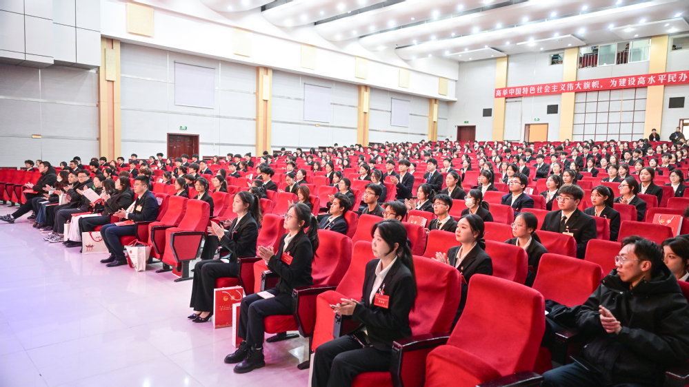 新一届学生会主席团成员汪丽丽同学作表态发言,表示将不负重托、服务同学、勇担使命。党委副书记郇东致闭幕词,号召全校团员青年要以此次大会为契机,传承红色基因,勇毅奋发前行,在青春的赛道上书写无愧于时代的华彩篇章。大会在激昂的团歌声中圆满落下帷幕。