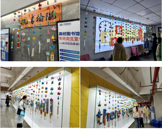 当日下午,志愿者们将收集到的近千只祝福纸鹤精心悬挂在考研自习室。五彩斑斓的纸鹤在灯光下轻轻摇曳,宛如冬日里绽放的暖阳,瞬间为紧张的复习氛围注入了温馨气息。不少学子复习归来看到这一幕,纷纷驻足拍照,在朋友圈“晒出”这份意外的感动:“刚吃完饭回来就被暖到了!这大概是冲刺阶段最治愈的礼物”“看着满室纸鹤,突然觉得所有疲惫都烟消云散了”。