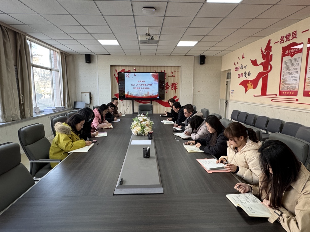 为全面落实立德树人根本任务,统筹推进新学期学生教育管理与思政引领工作,2026年3月1日,经济学院召开2025-2026学年第二学期学生管理工作安排会。学院领导班子及全体辅导员参会,行政院长周欣主持会议。