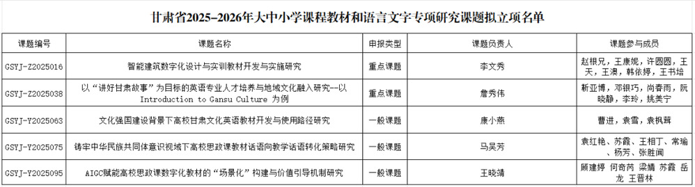 五项省级课程教材专项研究课题项目的成功获批,既是对各位老师扎实学术功底与严谨教学态度的高度肯定,也是我校长期重视教育学研究、深化课程教学改革的显著成果。未来,学校将持续依托专项研究项目,推动教学成果与教学实践深度融合,不断提升人才培养质量,为甘肃省大中小学课程教材建设与教育高质量发展贡献更大力量。