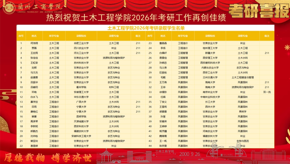 春潮涌动启新程,捷报频传贺丰收。随着2026年全国硕士研究生招生录取工作圆满落幕,土木工程学院2022级考研学子不负韶华、奋勇争先,再创考研佳绩,共有44名学生被广西大学、四川农业大学、宁夏大学、海南大学、南京林业大学等省内外知名高校成功录取。这份亮眼的成绩单,是学子们志存高远、脚踏实地的奋斗勋章,是全院教职工潜心育人、护航成长的责任担当,更是学院坚守育人初心、深耕人才培养,推动教育教学质量稳步提升的生动实践与有力佐证。