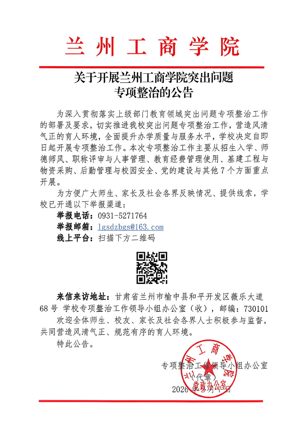 关于开展兰州工商学院突出问题专项整治的公告