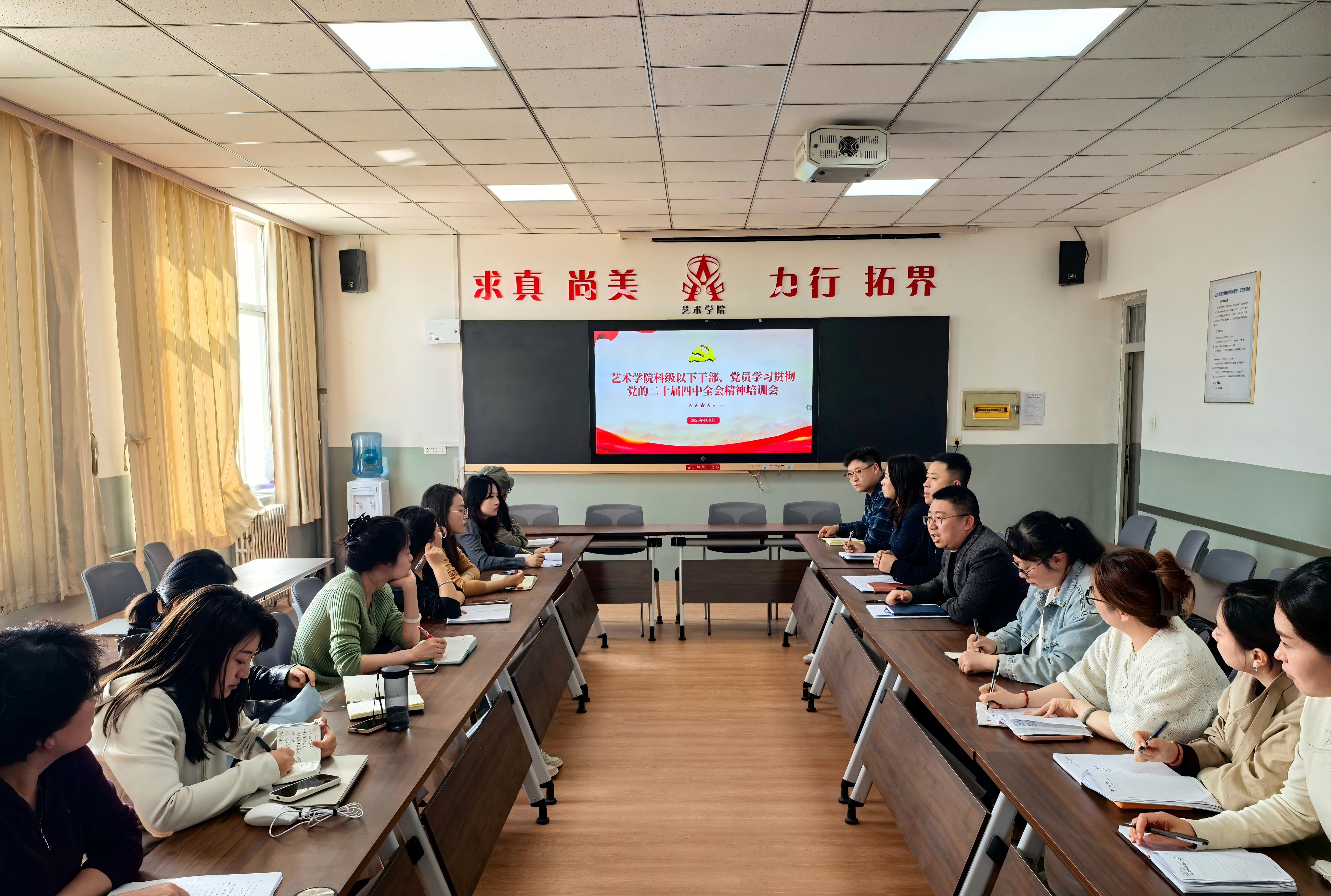 为深入学习贯彻党的二十届四中全会精神与全国两会精神,推动全会精神入脑入心、落地生根,切实把科级以下干部、党员的思想和行动统一到党中央决策部署上来,凝聚推动学院高质量发展的强大合力,2026年4月9日,艺术学院组织召开科级以下干部、党员学习贯彻党的二十届四中全会精神培训会,全体科级以下干部、党员参会学习。