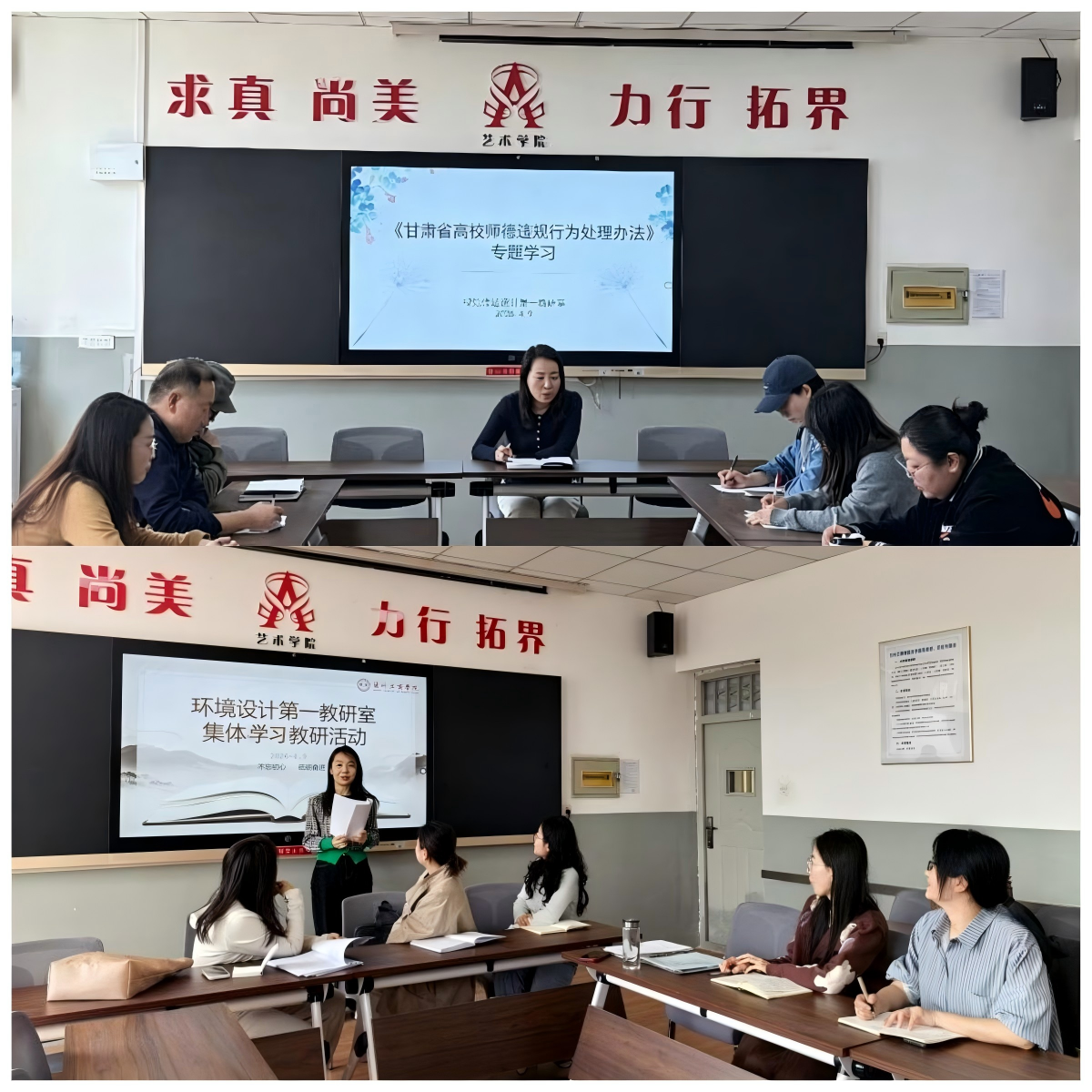 为深入贯彻落实立德树人根本任务,进一步规范全院教工职业行为,强化师德师风建设,筑牢教师师德底线,近日,艺术学院组织全院教工以集中学习、教研室研讨、个人自学相结合的多种形式,专题学习《甘肃省高校师德违规行为处理办法》(以下简称《办法》),切实将师德规范内化于心、外化于行,推动学院师德师风建设走深走实。