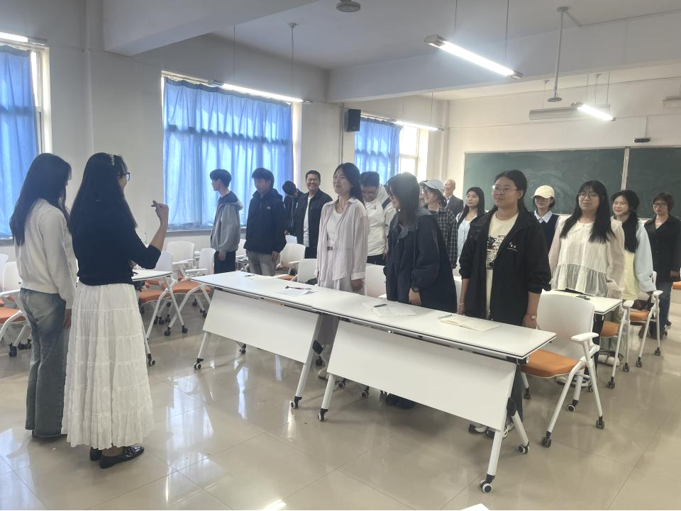 互动交流环节,现场气氛热烈。师生们围绕“传统礼仪如何适配当代生活”等问题踊跃提问,陈鸿雁教授作了耐心解答。随后,陈教授邀请现场所有师生起身进行站姿演练,从头部姿态、肩部舒展、腰背挺直到双脚站位,逐一纠正细节偏差,亲身示范标准站姿的核心要领。她强调,站姿不仅是外在形态的展现,更是内在精神风貌的体现,看似简单的动作背后,藏着对他人的尊重与自我修养的彰显。师生在亲身体验中,对礼仪的实操性有了更真切的认知。