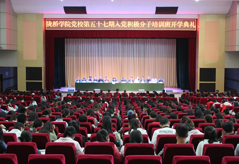 4月18日下午,陇桥学院党委党校第57期入党积极分子培训班开学典礼在学术报告厅举行。学院党委书记王新兰,党委副书记、副院长马义哈,党委委员、副院长杨培权,党委委员梁磊,党委委员刘伟,各党总支书记出席典礼,各系党务秘书、党委工作部老师及全体培训学员共700余人参加了典礼。典礼由党委副书记、副院长马义哈主持。