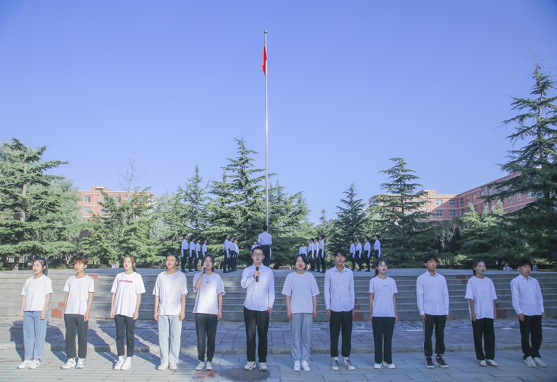 上午7:30,旭日光辉,全场肃穆而立,升旗仪式正式开始。国旗班同学迈着铿锵的步伐,护送鲜艳的五星红旗来到升旗台,伴随着庄严神圣的《中华人民共和国国歌》,在现场师生的注目下,五星红旗冉冉升起、迎风飘扬。