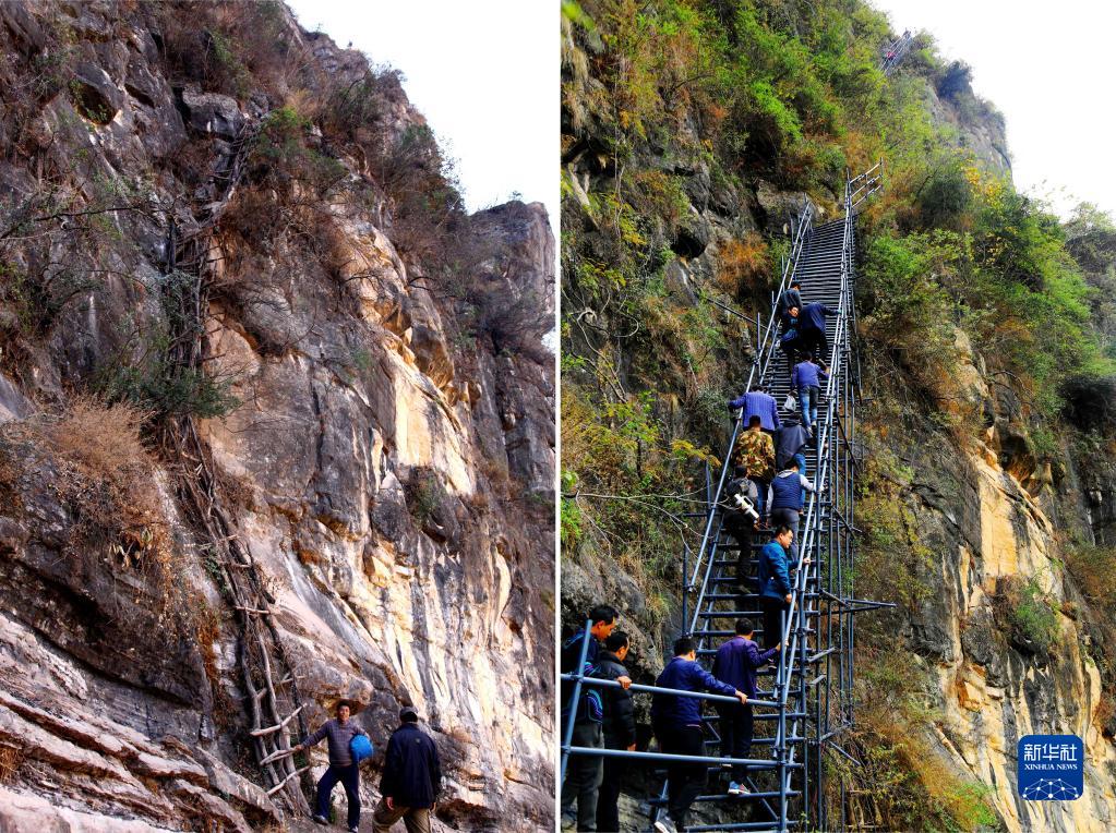 拼版照片:左图为2013年2月22日拍摄的四川省凉山彝族自治州昭觉县“悬崖村”阿土勒尔村的藤梯;右图为2016年11月29日,在四川省凉山彝族自治州昭觉县,人们沿着刚建好的钢梯登上“悬崖村”。