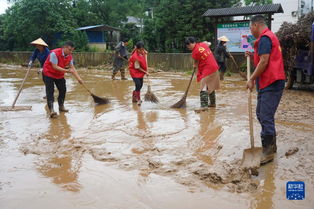 2022年6月21日,在江西省德兴市泗洲镇张家畈社区,党员干部在清理淤泥和垃圾。
