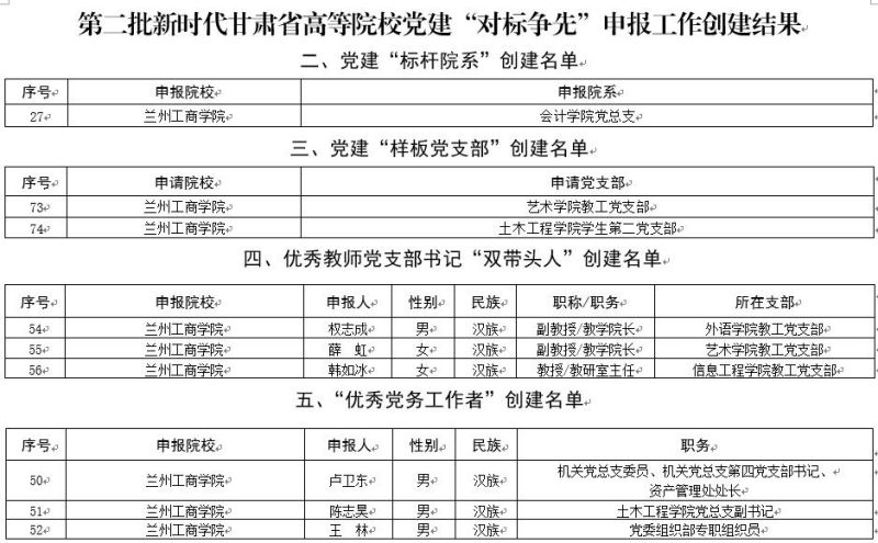 在第二批新时代甘肃省高等院校党建“对标争先”创建评审结果中,会计学院党总支入选“标杆院系”创建名单;艺术学院教工党支部、土木工程学院学生第二党支部2个党支部入选“样板党支部”创建名单;外语学院权志成、艺术学院薛虹、信息工程学院韩如冰3名教师党支部书记入选优秀教师党支部书记“双带头人”创建名单;卢卫东、陈志昊、王林3名同志入选“优秀党务工作者”创建名单。