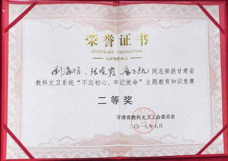 7月11日,甘肃省教科文卫系统“不忘初心、牢记使命”主题教育知识竞赛在兰州交通大学成功举办。由甘肃省教科文卫系统工会组织层层选拔出的18支参赛队54名优秀选手,进行了笔试和决赛的激烈角逐。陇桥学院代表队选派的刘海娟、廉正凯、张晓霞3名教师准备充分,表现出色;顺利进入决赛并荣获二等奖,我院工会荣获优秀组织奖。