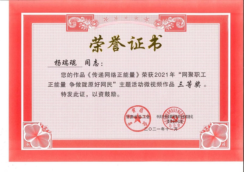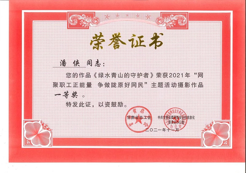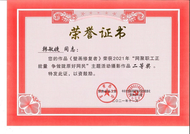 近日,由省总工会、省网信办主办的2021年“网聚职工正能量 争做陇原好网民”主题活动获奖作品名单公布,兰州工商学院工会选送推荐的作品,共有4部作品从全省1122部参赛作品中脱颖而出,分获三大类三个等次奖项。其中,摄影作品《绿水青山守护者》、《守艺人》荣获一等奖、摄影作品《壁画修复者》荣获二等奖,微视频作品《传递网络正能量》荣获三等奖。