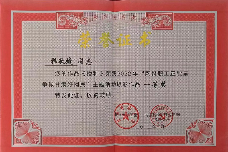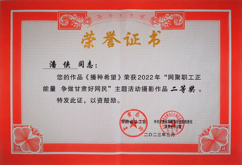 近日,由甘肃省总工会、甘肃省委网信办主办的2022年“网聚职工正能量·争做甘肃好网民”主题活动作品评选结果揭晓。我校工会选送的摄影作品《劳动的果实朴实无华》、《播种》获一等奖,《播种希望》获二等奖。