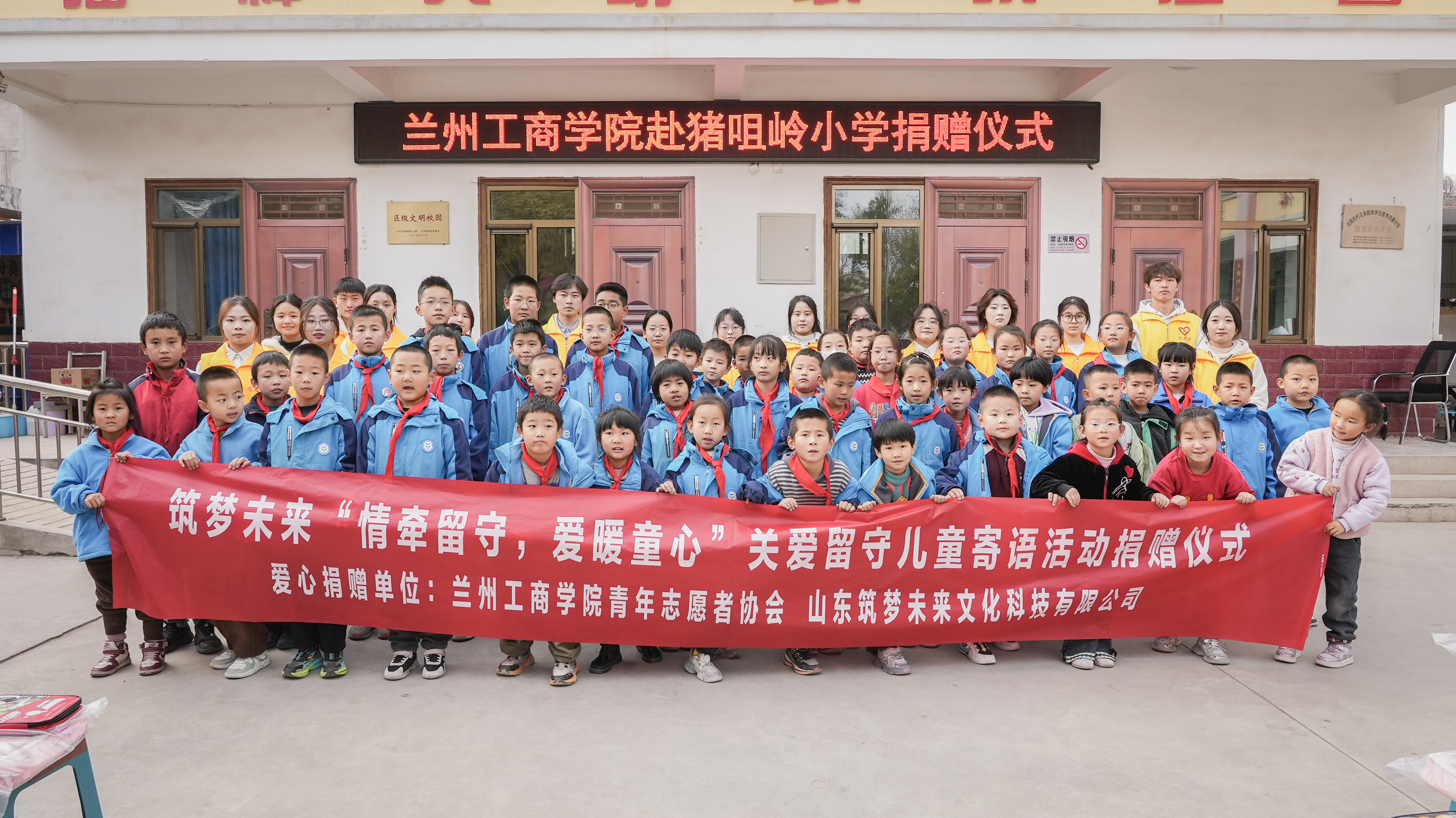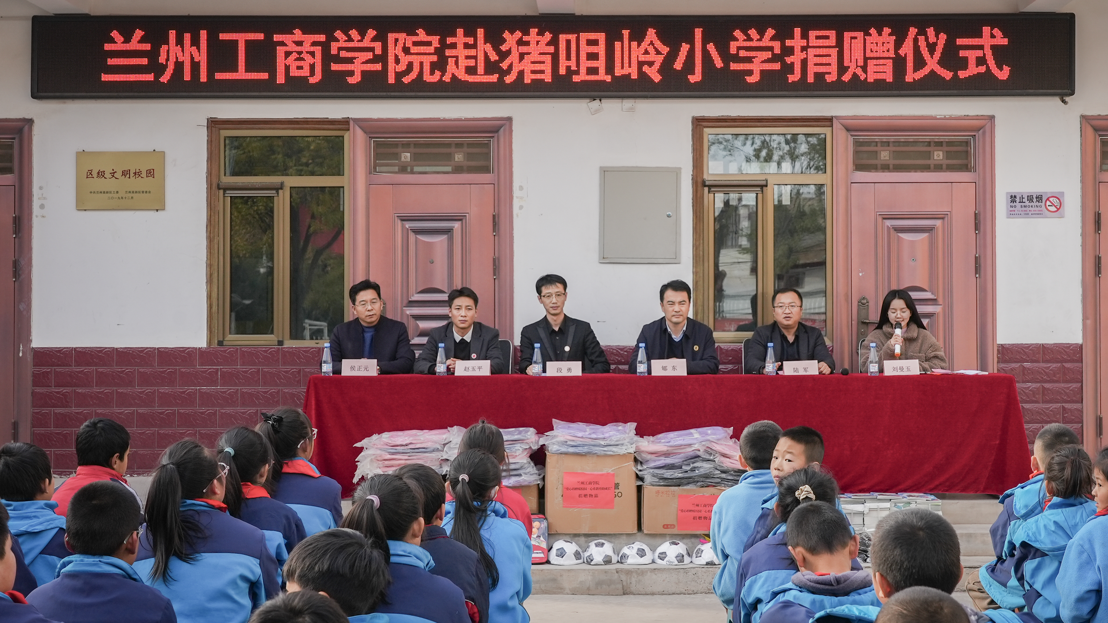 2024年11月22日下午,兰州工商学院党委副书记、副校长郇东,团委书记段勇、团委赵玉平老师带领兰州工商学院青年志愿者们满载爱心与希望,前往猪咀岭小学开展了一场意义深远的物品捐赠活动。捐赠仪式在猪咀岭小学举行。此次捐赠的物品包括书籍、书包、足球、跳绳、球拍等文体用品,旨在为猪咀岭小学的孩子们送去温暖的关怀,丰富他们的课余生活,助力乡村教育事业的发展。
