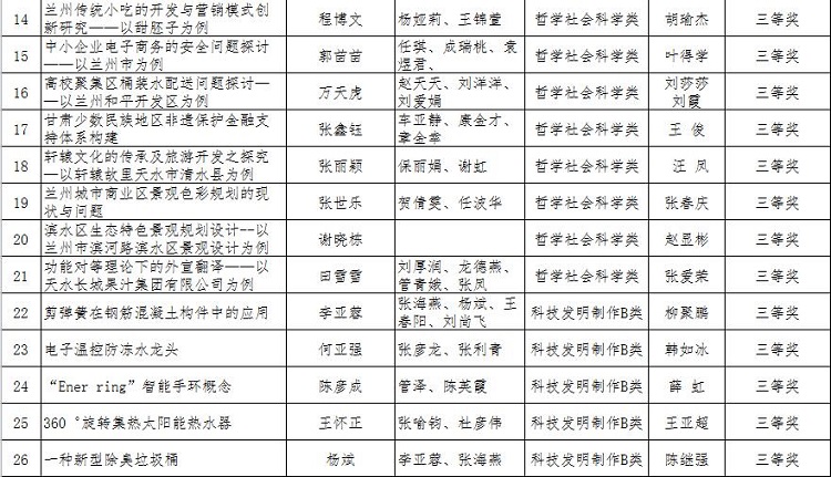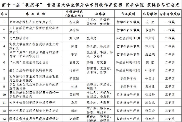 本届大赛陇桥学院通过校内审核、初赛、复赛等环节共申报30件作品参加省赛,最终有26件作品进入终审决赛并获奖,其中由金莹老师指导的《甘肃酒泉枸杞产业竞争力研究》、李晓辉老师指导的《庆阳剪纸艺术生产性保护现状与对策研究》共2件作品获得一等奖;由韩如冰老师指导的《论文排版助手》等5件作品获得二等奖;由张依山老师指导的《静宁苹果的互联网销售分析及建议》等19件作品获得三等奖;学院以760分的团体总成绩在40个参赛单位中位列第15名,并获得“优秀组织奖”。