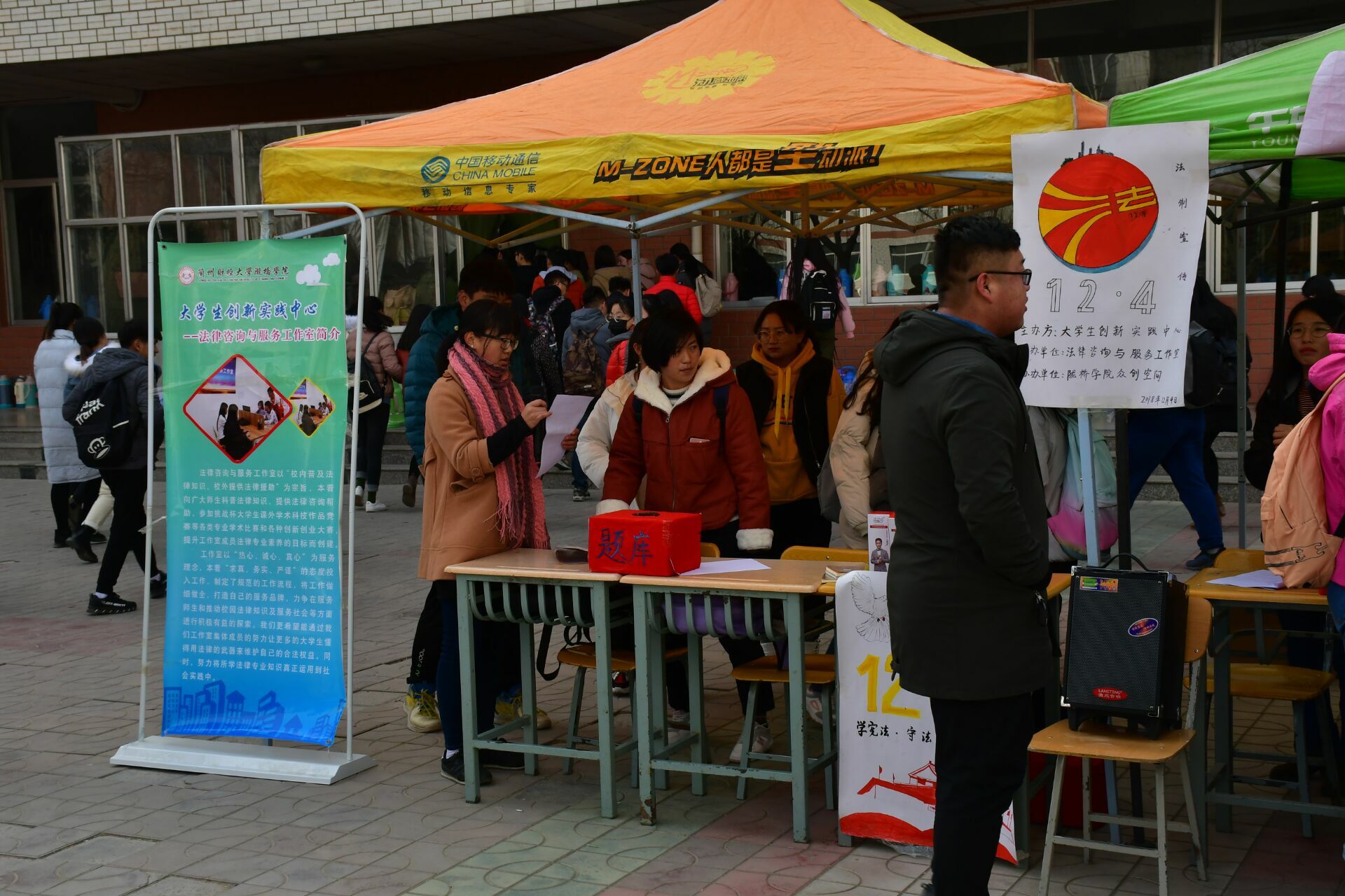 2018年12月4日,以“弘扬法治精神,推进法治建设”为主题的法制宣传活动在陇桥学院食堂前开展。本次活动由陇桥学院大学生创新实践中心主办,法律咨询与服务工作室承办。