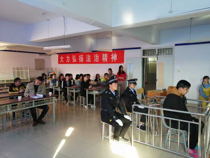 首先,从庭审模拟书记员对庭审纪律的宣读到最后模拟法官对被告的当庭宣判,同学们演习了整个过程。过程中全部角色都表现出严谨的态度和周密的思维逻辑。庭审完全按照真实的诉讼程序有序进行。庭审现场庄严肃穆,审判员铿锵有力的宣判诠释了法律的神圣不可侵犯。活动展示内容新颖,案例材料丰富。最后庭审活动在热烈的掌声中圆满结束。