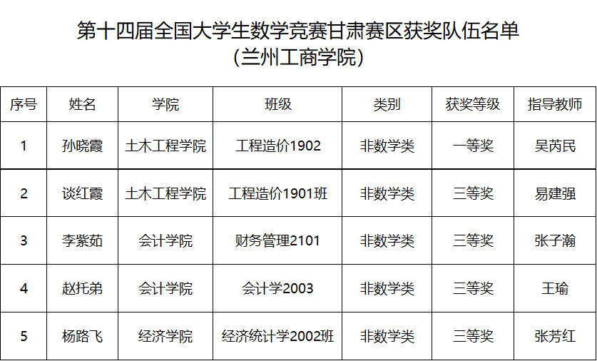 近日,甘肃省数学会公布了《第十四届全国大学生数学竞赛甘肃赛区获奖队伍名单》,我校学子在此次竞赛中发挥出色,再创佳绩,荣获一等奖1项,三等奖4项。