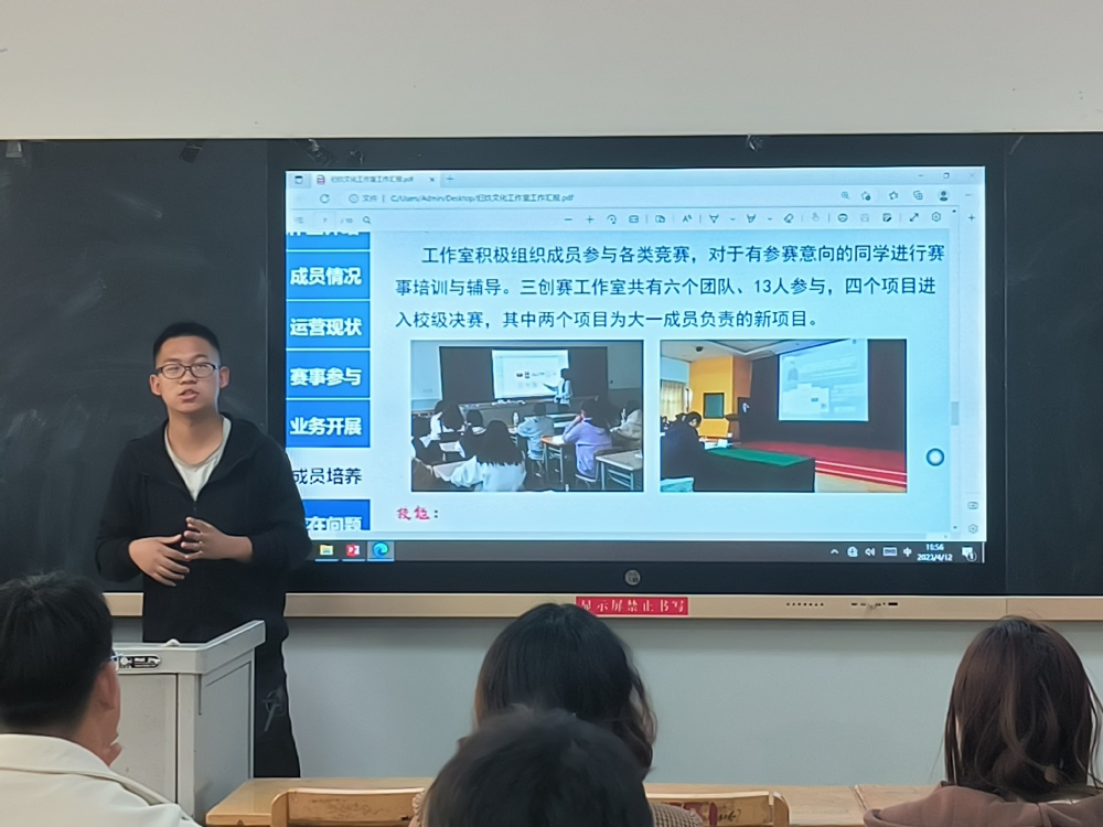 为进一步落实我校兰州工商学院众创空间“创新引领创业、创业带动就业”的工作目标,加强各入孵企业沟通协调能力,营造良好的创新创业氛围,2023年4月12日下午16:30在2号教学楼107教室,兰州工商学院兰州工商学院众创空间成功举办了入孵企业工作会议。大学生创新实践中心宋宁馨老师、各入孵企业负责人共16人参加会议。