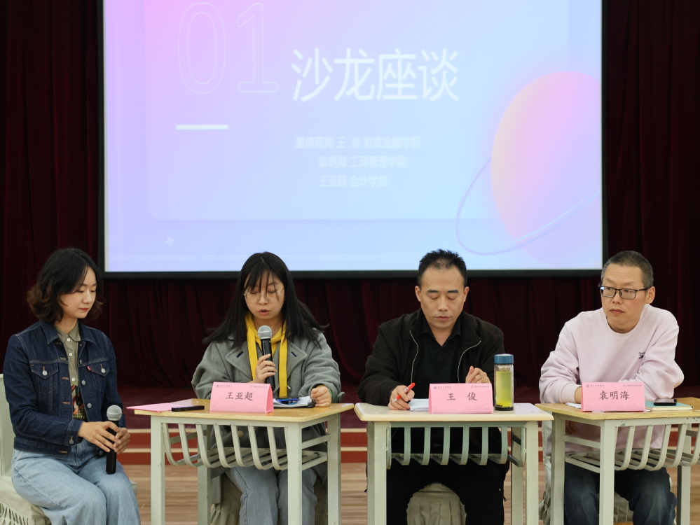 首先是“沙龙座谈”环节。邀请了本次创新创业导师培训班的三位老师进行分享交流。来自工商管理学院袁明海老师进行关于培训心得的分享,来自会计学院的王亚超老师进行如何和学生更好的进行创新创业活动的交流的分享,来自财政金融学院的王俊老师就各类竞赛参赛经验向与会师生进行分享。三位教师带来的精彩内容让在场师生受益匪浅。