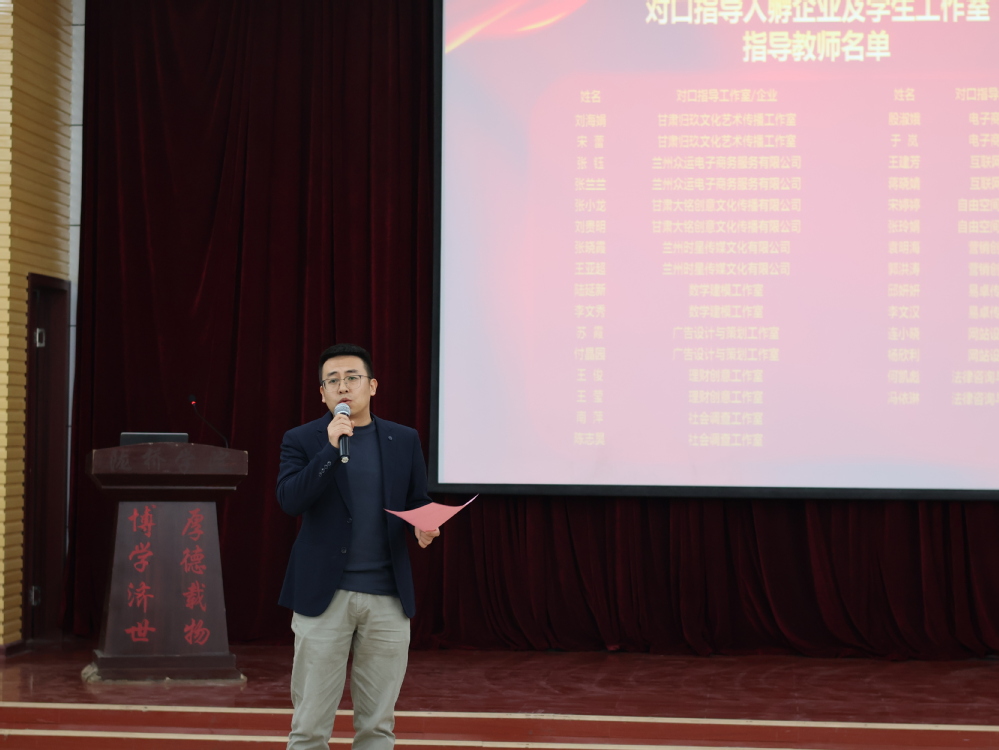 第三个环节为“持证上岗”。由大学生创新实践中心张浩副主任宣读众创空间创新创业指导教师与入孵企业及工作室匹配方案。并邀请兰州工商学院校长助理康昱明、大学生创新实践中心副主任张浩为30位创新创业导师颁发聘书。通过师资支持助力学生企业及工作室全面发展。