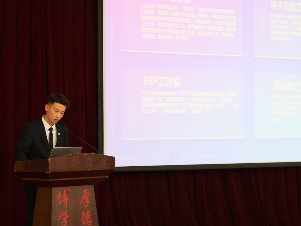 第二个环节为“自报家门”。首先由兰州工商学院众创空间营销创意工作室韩浩博同学向在场师生介绍12家工作室,接着由入孵企业分管主席刘永贤同学对7家入孵企业进行介绍。通过两位学生干部的介绍,让在场师生更加了解陇桥学院众创空间的现状,并且为后续发展做好充分的铺垫。