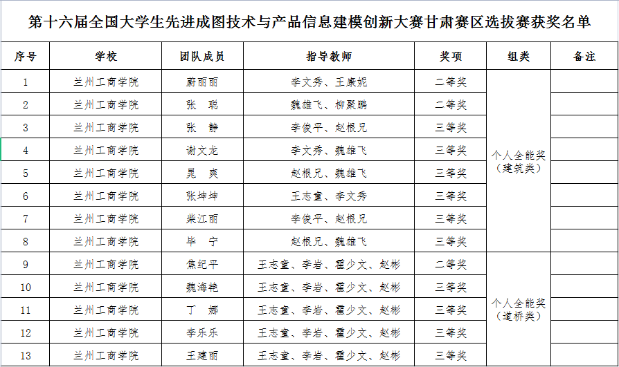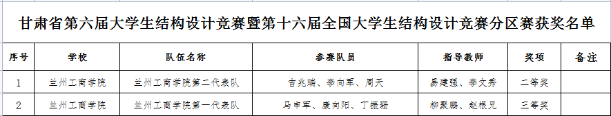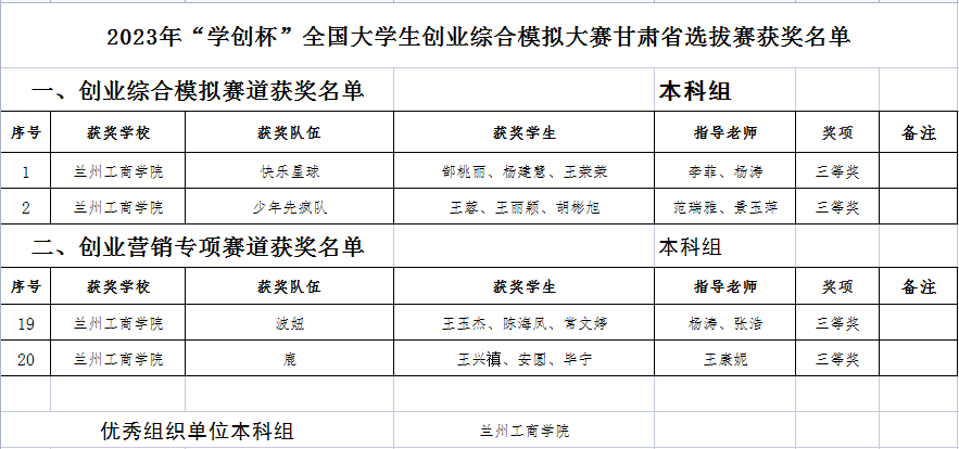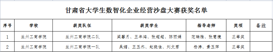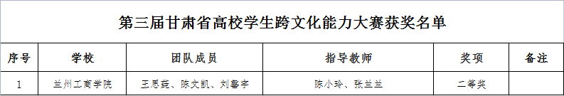 根据《甘肃省教育厅关于公布2023年省级大学生学科专业竞赛项目的通知》(甘教高函〔2023〕9 号)公布的2023年上半年由省教育厅主办、相关高校承办的11项省级大学生学科专业竞赛项目获奖名单,兰州工商学院在“第十六届全国大学生先进成图技术与产品信息建模创新大赛甘肃赛区选拔赛”、“第三届甘肃省高校学生跨文化能力大赛”、“甘肃省第六届大学生结构设计竞赛暨第十六届全国大学生结构设计竞赛分区赛”、“2023年“学创杯”全国大学生创业综合模拟大赛甘肃省选拔赛”、“甘肃省大学生数智化企业经营沙盘大赛”五项大赛中共获得二等奖5项,三等奖17项,优秀组织单位(本科组)1项。