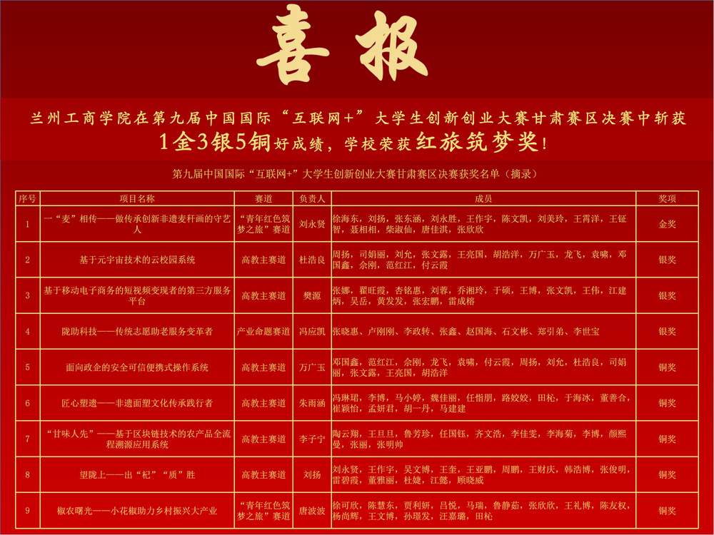 我校学生在本届大赛中斩获1金3银5铜突破性成绩,其中《一“麦”相传——做传承创新非遗麦秆画的守艺人》获得金奖、《基于元宇宙技术的云校园系统》等3个项目获得银奖、《面向政企的安全可信便携式操作系统》等5个项目获得铜奖。同时,兰州工商学院荣获“红旅筑梦奖”。值得一提的是,《基于元宇宙技术的云校园系统》项目被推荐参加第九届中国国际“互联网+”大学生创新创业大赛国赛,也是我校首次参加“互联网+”国赛。