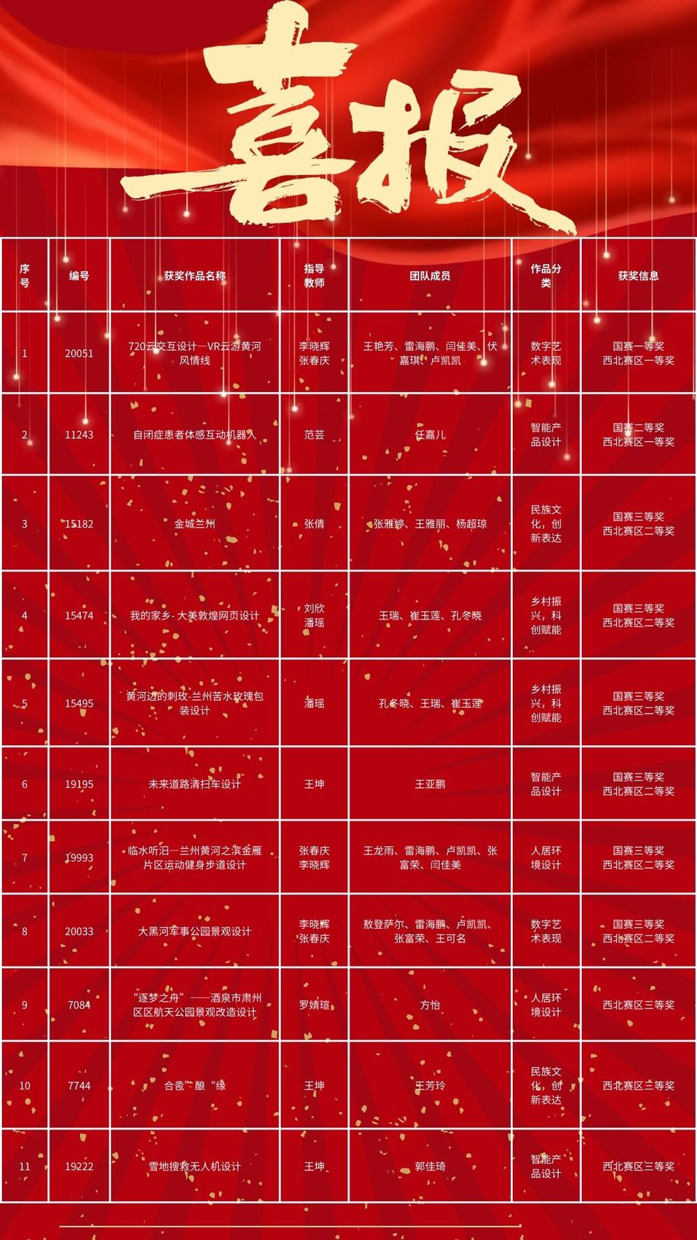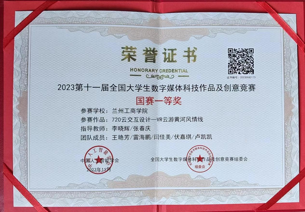 参赛作品《720云交互设计——VR云游黄河风情线》 荣获2023年第十一届全国大学生数字媒体科技作品及创意竞赛国赛一等奖,《自闭症患者体感互动机器人》荣获2023年第十一届全国大学生数字媒体科技作品及创意竞赛国赛二等奖。其他还有6项作品荣获国家级三等奖(西部地区二等奖),3项作品荣获西部地区三等奖,具体获奖信息如下: