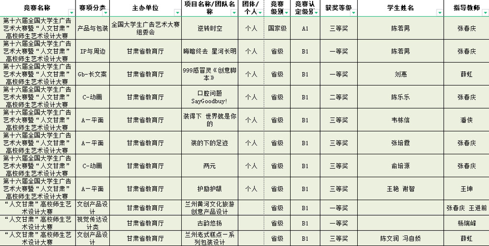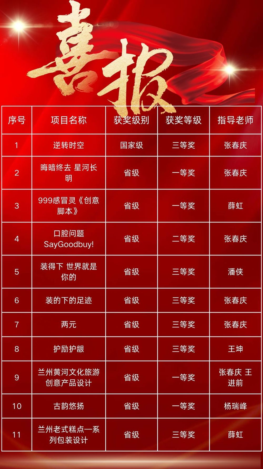 由张春庆教授指导的《逆转时空》参赛作品获得国家级三等奖,《999感冒灵<创意脚本>》《晦暗终去 星河长明<IP与周边>》参赛作品荣获第十六届全国大学生广告艺术大赛省级一等奖。教师设计作品《兰州黄河文化旅游创意产品设计》《古韵悠扬》获奖“人文甘肃”高校师生艺术设计大赛省赛一等奖。具体获奖信息如下: