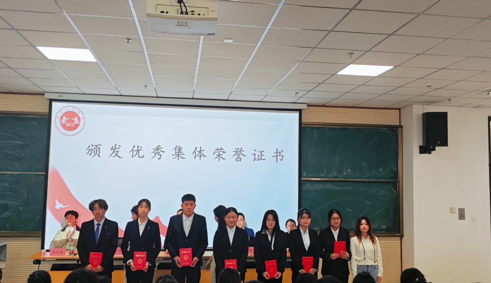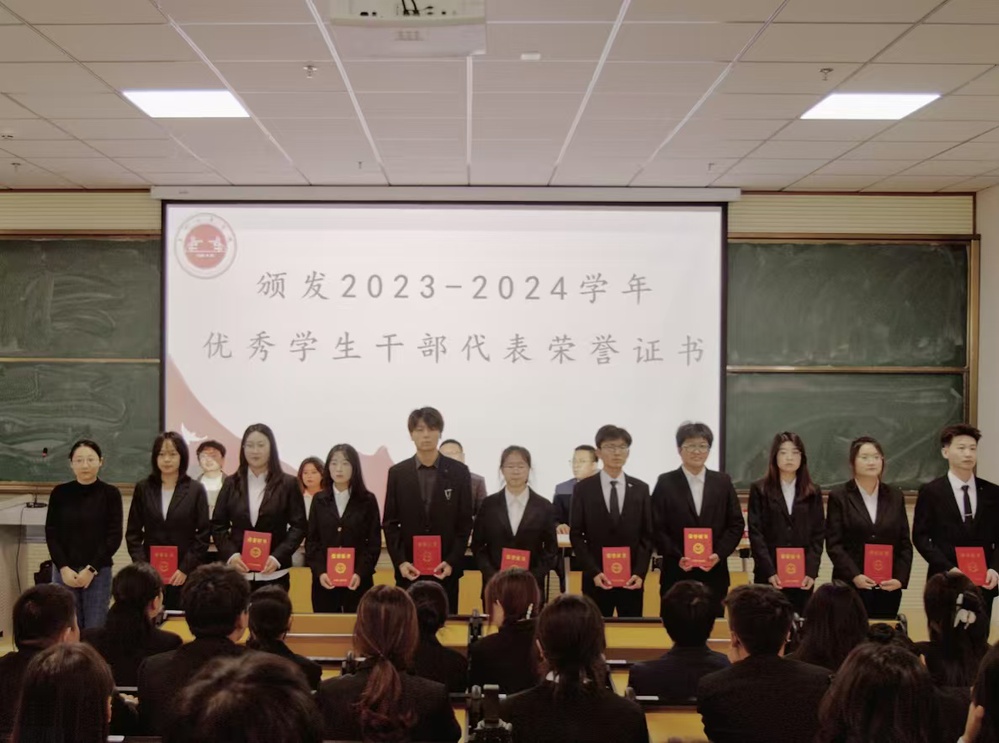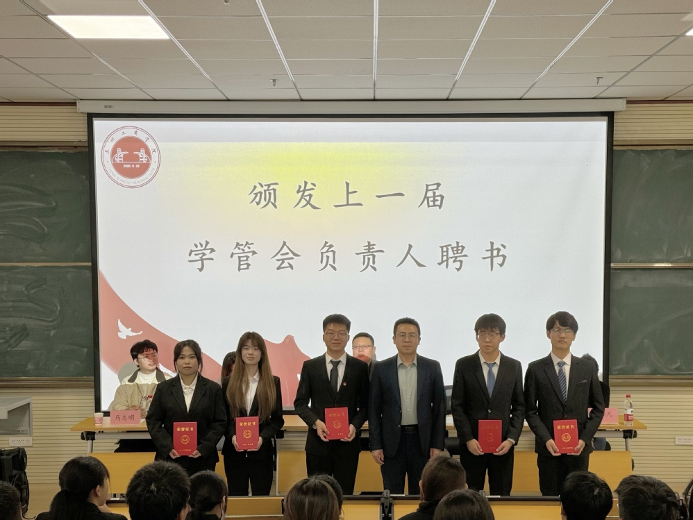 会上,大学生创新实践中心夏颢凡老师为优秀学生干部代表颁发荣誉证书、祁琛老师为优秀集体颁发荣誉证书、张浩副主任为上一届学管会负责人代表颁发聘书、副校长张春庆颁发竞赛突出贡献奖。