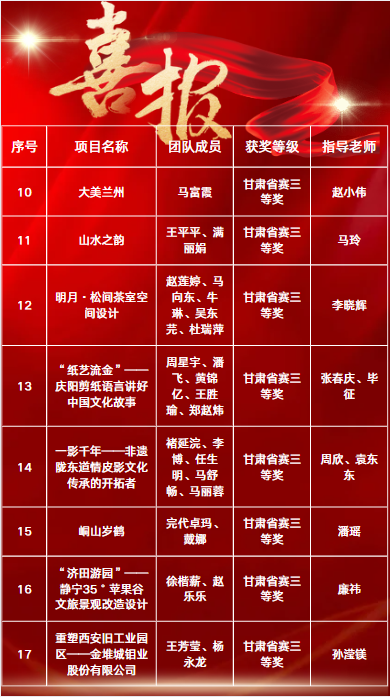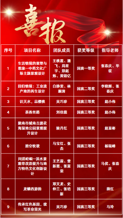 张春庆教授和毕征老师共同指导的学生团队参赛作品《生活情境的重塑与想象--中药文化广场主题景观设计》 荣获2024年第十二届全国大学生数字媒体科技作品及创意竞赛国赛一等奖;李晓辉副教授和张春庆教授共同指导的学生团队参赛作品《回归情境:工业遗产地的再生设计》荣获国赛二等奖,我校6项作品荣获国赛三等奖(甘肃赛区二等奖),8项作品荣获甘肃赛区三等奖。