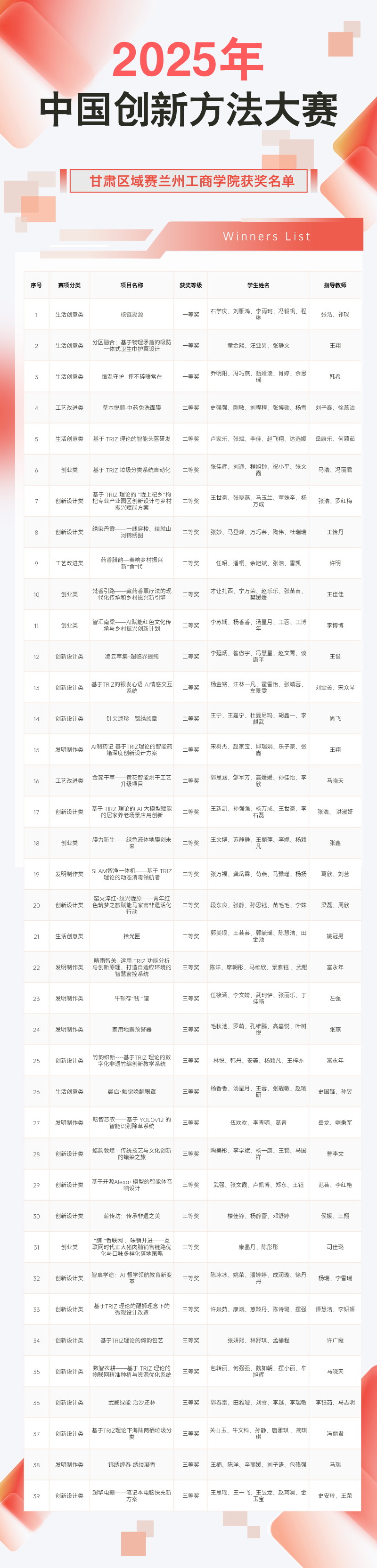 同时,兰州工商学院被授予“优秀组织单位”荣誉称号,体现了赛事主办方对学校在创新方法教育、赛事组织与人才培养方面工作的认可。