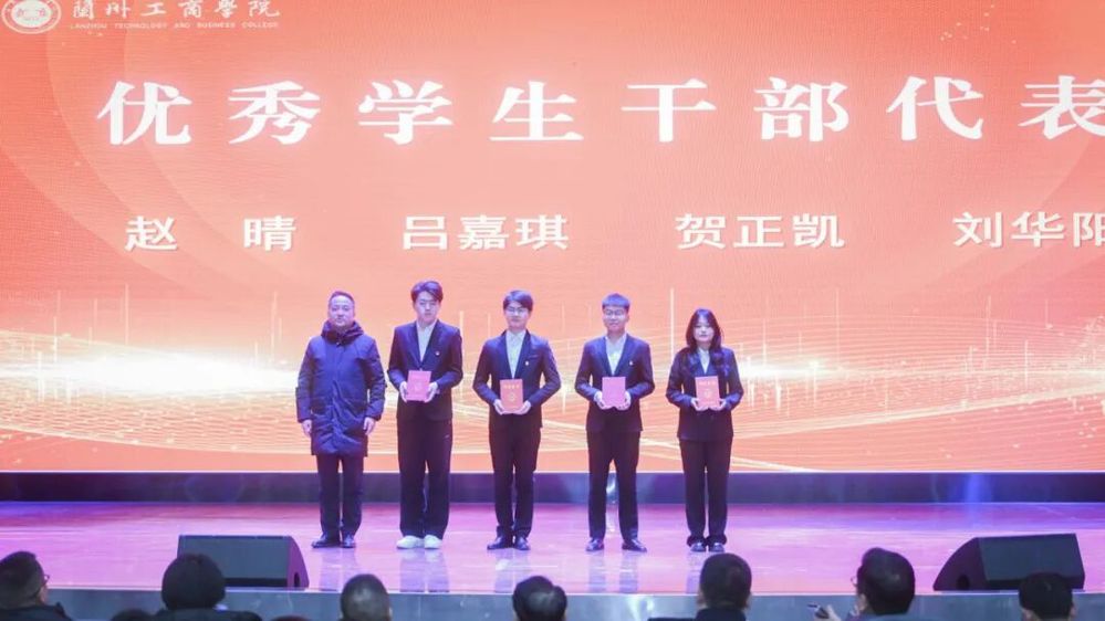 在热烈的氛围中,大会先后进行了两项重要表彰。张浩首先宣读了《兰州工商学院2024-2025学年学生创新创业能力提升奖表彰决定》。王华栋、张春庆分别为获得该奖项一等奖和二等奖的学生代表颁奖,表彰他们在日常学习和实践中展现出的持续创新能力。