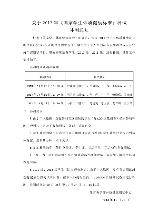 关于2013年《国家学生体质健康标准》测试补测的通知