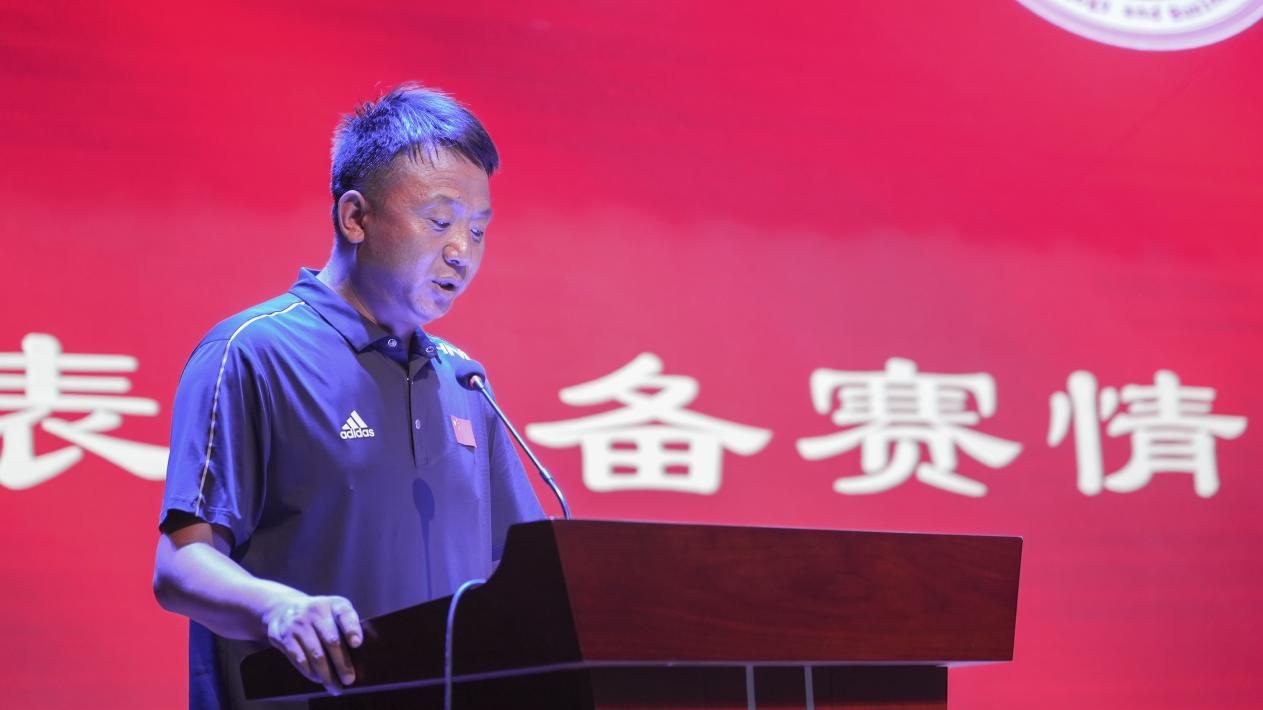 代表团秘书长、体育教学部主任袁育明介绍了本届大运会我校代表团备赛情况。本届大运会将于7月15日至29日在甘肃警察职业学院举行,我校共有八支代表队,107名运动员,14名教练员,参赛人数创我校历届最高,将参加甲组田径、篮球、排球、足球、羽毛球、乒乓球、健美操七个大项40个余个小项的角逐。