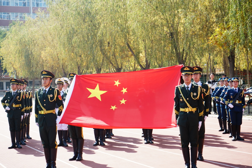 国旗护卫队迈着铿锵有力的步伐拉开了序幕。伴随着庄严的国歌声,全体师生面向国旗行注目礼,奏唱国歌。