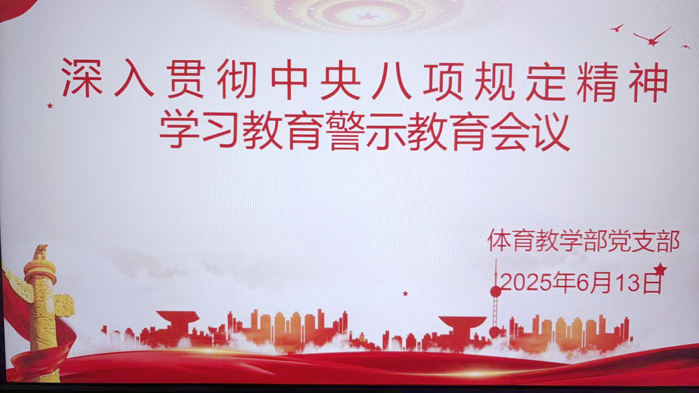 为进一步强化纪律意识,筑牢思想防线,推动全面从严治党向纵深发展,6月13日上午,体育教学部组织召开深入贯彻中央八项规定精神学习教育警示教育会议,部门全体教职工参会。