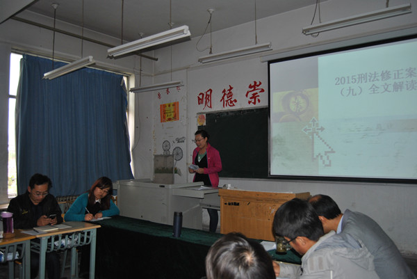 2015911日下午,法学系全体教师在博学楼509教室学习研讨《中华人民共和国刑法》修正案(九),学习研讨会由法学系主任蒲春平副教授主持。