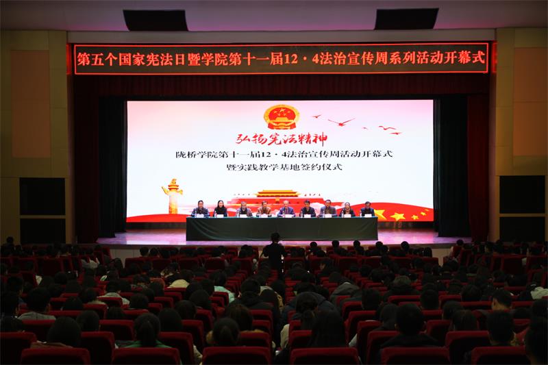 在第五个国家宪法日来临之际,为认真学习党的十九大精神及习近平新时代中国特色社会主义思想,贯彻习近平总书记关于法治宣传教育的重要指示,扎实做好“七五”普法各项工作,同时为促进校园法治建设,丰富校园文化活动,学院于2018113017:00在学术报告厅举办了陇桥学院第十一届“12.4”法治宣传周开幕式暨实践教学基地签约仪式。学院副院长杨培权、党委副书记郇东、副院长燕宏、副院长高军、北京大成(兰州)律师事务所主任李张发、团委副书记康思忆、法学系领导班子出席了本次活动,北京大成(兰州)律师事务所的律师代表和学院师生代表参加了本次活动。活动由法学系党总支副书记晋如意主持。