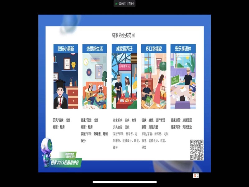 链家校园宣讲官张一悦首先对链家的企业发展、企业文化、业务范围、薪资福利、培养体系、晋升通道等做出了详细的介绍。又通过短视频向大家讲述了大学毕业生步入社会时会遇到的一些问题,如何寻找自己的价值体现以及这个行业能带来什么,学生在面对就业困难时应该如何选择,让学生对西安链家有了一个更深层次的了解。最后链家校园宣讲官与我院学生进行线上互动,并就如何提交简历进行了进一步的说明。
